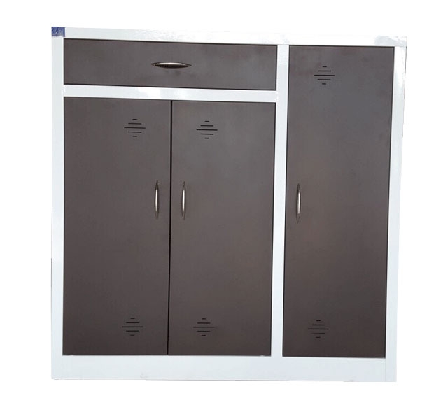 Phía dưới ngăn kéo có 1 khoang to để đựng giầy dép, bên trong có các đợt đi động có thể di chuyển tùy vào người dùng.Bên phải có ngăn dài bên trong có các đợt di động.Tay nắm ở các cánh tủ có tay nắm thép mạ Cr-Ni.